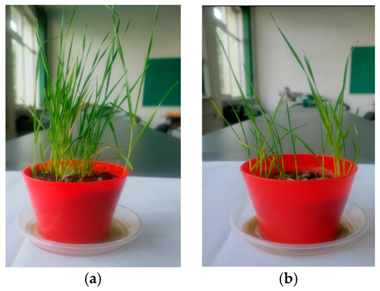 Figure 12. Plant development of wheat (Triticum aestivum) under different soil conditions: (a) seedlings grown in contaminated soil; (b) seedlings grown in commercial control soil.