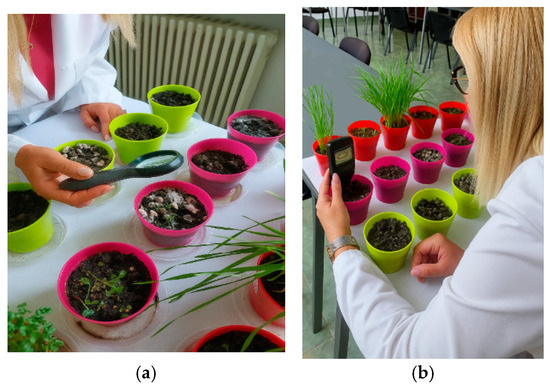 Figure 14. Observation procedures for plant development: (a) close-up visual assessment of the soil surface and emerging seedlings; (b) quantitative chlorophyll measurement on leaves with a portable SPAD meter.