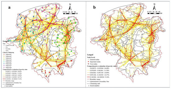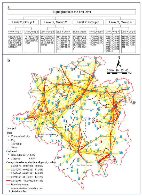 - Analysis of the Overall Structure of the Urban Network in Qiandongnan: Figure 7a shows that there are three levels of cohesive subgroups consisting of eight clusters in the urban units of Qiandongnan, with subgroups of varying sizes, and four clusters of the second level can be formed by two closely related clusters.