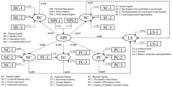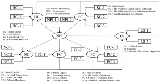 This study has designed the relationships among national park impacts, livelihood capitals, and livelihood state, but in the specific structural equation, the three hypotheses (H1, H2, H3) need to be refined. When using structural equation modeling (SEM) to investigate relationships between latent variables, it is necessary to formulate hypotheses regarding the relationships among these latent variables and evaluate whether these hypotheses are empirically supported through data analysis [73]. This process allows for a discussion of the model’s explanatory power. As this study fundamentally follows an exploratory research logic grounded in field survey data, it cannot pre-estimate the statistical significance of effects (i.e., the magnitude of path coefficients between variables). However, reasonable hypotheses about the directionality (positive/negative nature) of these relationships can be proposed, as follows: