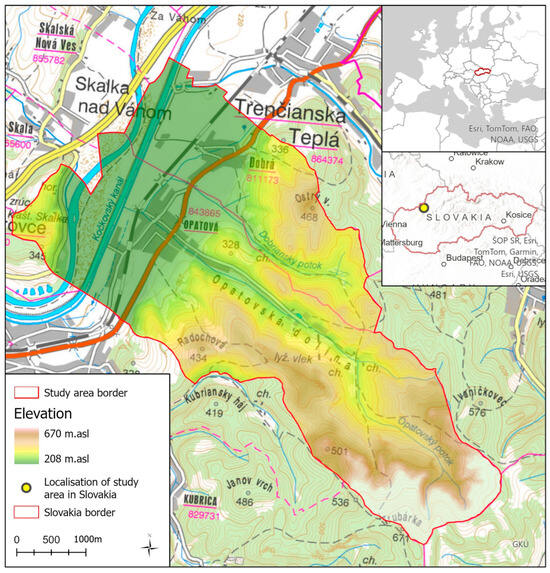 Dobrá–Opatová was chosen as the study area for this contribution (48°54′56.25″ N, 18°6′24.17″ E). The area is located in the central part of Slovakia, the region of Stredné Považie, and the district of Trenčín (Figure 1). The area is 1 954 ha and with mean elevation of 325 m.asl and varying between 207 and 670 m.asl. The Váh River (the longest river in Slovakia) flows through the area. The average annual temperature of the area is 9 °C, and the average annual precipitation is 750 mm (Slovak Hydrometeorological Institute, https://www.shmu.sk/). The most prevalent soil type in the area is rendzina, primarily covering forested regions. Agricultural lands are mostly comprised of loamy soil, known as brown earth, while fluvial soil is typically found around watercourses [25].