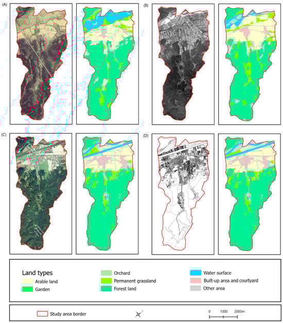 Figure 2. The basis for the land-type identification. (A) Second Military Survey from 1850; (B) aerial photographs from 1949; (C) aerial photographs from 2010; (D) cadastral map from the year of 2024 as a basis for the land-type delineation.