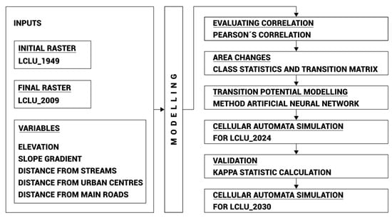 Vectorisation, rasterisation, and work with attributes were performed using the GIS software ArcGIS Pro 3.5.0. The prediction of LCLU changes to 2030 was conducted using the GIS software QGIS 2.8.9; MOLUSCE plug-in (https://plugins.qgis.org/plugins/molusce/) (accessed on 23 July 2024). The overview of modules used by MOLUSCE is shown in Figure 3.
