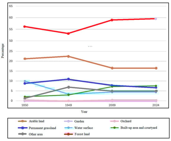 Figure 5. The percentage changes in land-use elements over the years 1850–2024.