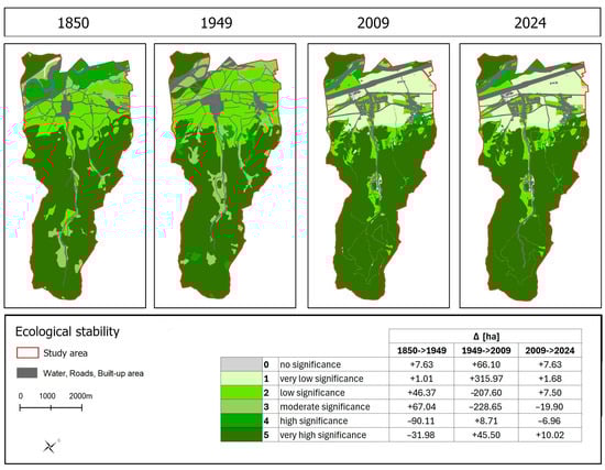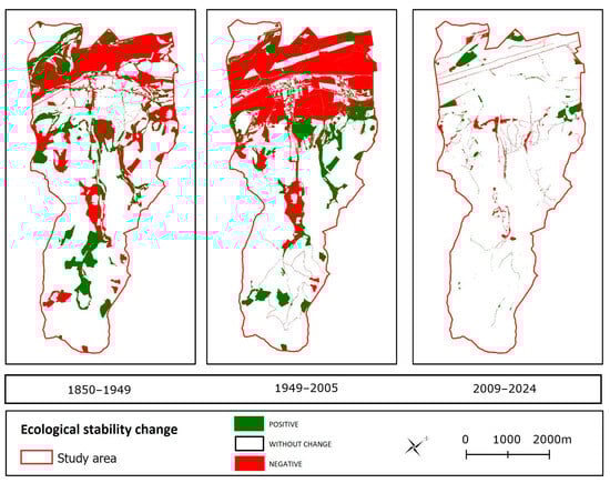 Figure 7 graphically illustrates changes in ecological stability over time horizons. The table (Table 3) shows the percentage of change in ecological stability between three time periods: 1850–1949, 1949–2009, and 2009–2024. The data is categorised into three types of changes—positive, negative, and without change—with the 2009–2024 period showing only minor changes due to its short duration and the limited ecological impact of the land consolidation carried out in the area.