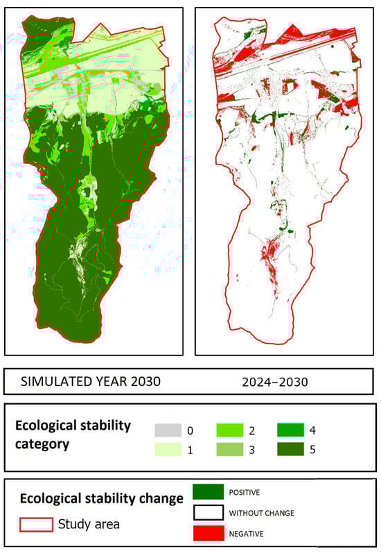 Figure 8. Simulated ecological stability for the model area for the year 2030 (5—very high significance; 4—high significance; 3—moderate significance; 2—low significance; 1—very low significance; 0—no significance) and the change in ecological stability between 2024 and the simulated year 2030.