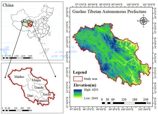 Golog Tibetan Autonomous Prefecture is located in the eastern Qinghai–Tibet Plateau (Figure 1) and forms part of the Yellow River source region. The study area has a total area of 74,200 km2, whose elevation ranges from 2846 to 6293 m. With ample sunlight and water resources but moderately low heat, the prefecture features a typical plateau continental climate. The mean annual temperature is −4 °C, with no consistent frost-free period throughout the year [37].