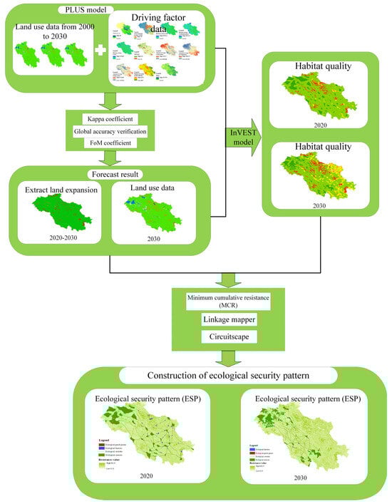 The “ecological security pattern” refers to a possible spatial pattern of ecosystems within a landscape [73]. Establishing predictive ecological security patterns, comparing patterns across different time periods, and regulating ecological processes to ultimately establish regional ecological security systems are feasible strategies [74]. Current research often focuses on remote sensing-based predictions of ecological threats [75], evaluations of ecological security in vulnerable areas, and the patterns of spatial and temporal variation of ecological security of landscapes [76]; the full range of potential effects of land-use change on habitat quality and ecological security patterns are often overlooked. By combining the PLUS model, InVEST model, and ecological security patterns, we examined ecological changes in the region and put forward recommendations for restoration. Therefore, we combined the PLUS model and InVEST model with the ecological security patterns to examine ecological changes in the region and put forward recommendations for restoration.