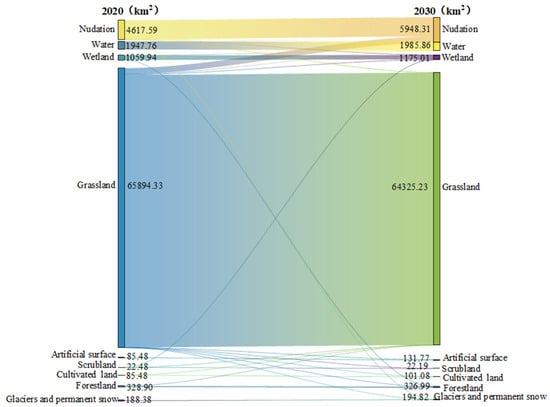 The land-use system, comprising various land-use types, is a complete system. The primary land-use type in Golog Tibetan Autonomous Prefecture is grassland, and in higher-altitude areas, bare land occupies a relatively large proportion (Figure 3). Our analysis of land-use changes in Golog Tibetan Autonomous Prefecture for 2020 and 2030 shows increases in the areas of cultivated land, wetland, water, artificial surface, nudation, and glaciers and permanent snow, with the largest increase observed in nudation, which grew by 1330.72 km2. The areas of forestland, grassland, and scrubland decreased, with grassland experiencing the largest reduction of 1569.11 km2 and a total land-use transfer area of 1571 km2. Analysis of the land-use change matrix indicates that most of the reduction in grassland was converted to nudation, with the remaining portion moving to wetland, artificial surface, and agricultural land (Figure 4).