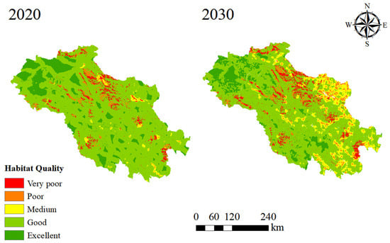 The habitat quality of the study area was measured on a continuous scale from 0 to 1 using the Habitat Quality module in the InVEST model. The nearer the value is to 1, the higher the ecological quality in the study area, the lower the extent of human activity impact, and the greater the ecological benefits demonstrated by the land. Using the InVEST model, the habitat quality distribution maps for 2020 and 2030 in Golog Tibetan Autonomous Prefecture were obtained (Figure 5). To more intuitively represent the spatial distribution of habitat quality, the distribution maps were classified into five levels using the Natural Breaks method in ArcGIS: very poor (0–0.2), poor (0.2–0.4), medium (0.4–0.6), good (0.6–0.8), and excellent (0.8–1) [65].