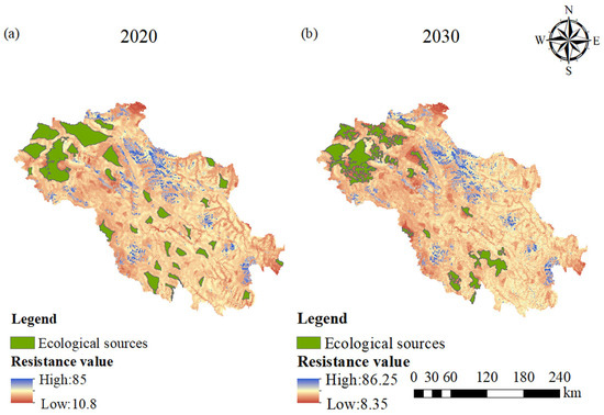 Ecological source and resistance surface of Guoluo Tibetan Autonomous Prefecture in 2020 and 2030.