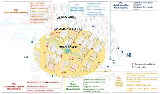 Area Cultural Linkage (ACL) focuses on the potential connections between SCHSs and other historical and contemporary cultural resources in a community area. It is a dimension for assessing the reciprocal relationship and promotion of SCHSs and an area’s culture. ACL included four indicators: “Whether the heritage site is located in a historical and cultural district” reflects the overall conservation situation of the area; “Number of other heritage sites” and “number of other heritage sites of the same heritage series” reflect the aggregation situation and linkage potential of regional historical resources; and “Number of other public cultural facilities” reflects the scale of the contemporary cultural facilities that have the potential to be utilized.