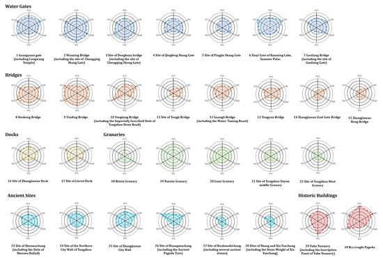 The assessment results of the indicators and dimensions of the 30 SCHSs are presented in Supplementary Materials File S4 (Figure 3 and Figure 4). In the HVCs dimension, the Randengfo Pagoda has the highest score alone, reflecting its comprehensive advantages in terms of conservation level, historical depth, scarcity, and conservation and utilization levels. The SECs show the highest overall level, indicating that the comprehensive level of the open spaces where most SCHSs are located is relatively high. The outliers of the SECs are mainly low values, existing in the Beixin Granary that was closed due to being occupied by units, as well as one granary and two ancient sites in a relatively remote area of Tongzhou. However, the overall level of ACL is relatively low, but the SCHS group located around Shichahai Lake and Yuhe River, as well as the newly updated Nanxin Granary, perform well as outliers. The dispersion of the PCCs is the highest among all the dimensions, indicating a significant difference in the cognition of the SCHSs of the Beijing section of the Grand Canal by the general public. By comparing PCCs with CCCs, it can be seen that the overall level and dispersion of community cognition are significantly better than those of PCC.