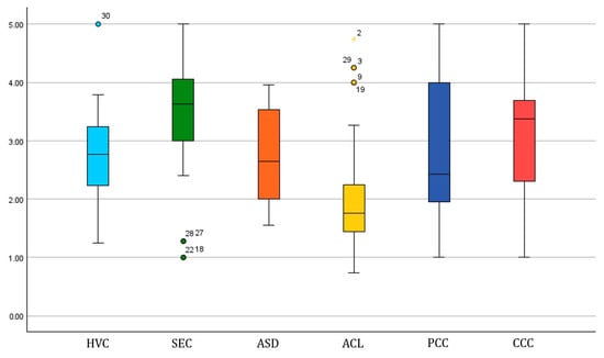 Comparative analysis of box plots in six dimensions (The numbers represent the SCHSs as shown in Figure 2).