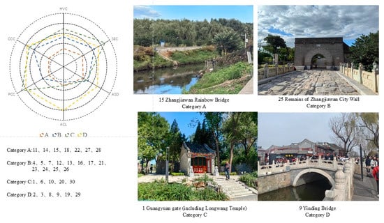The Analyzing Hierarchical Clustering method was used to classify the 30 SCHSs into four categories according to the total dimension scores of the six dimensions (Figure 5). The comprehensive level of the assessment results gradually increased from category A to D. Category A had structural deficiencies in all dimensions, mostly including bridges, granaries, and ancient sites, and was mainly distributed in the Tongzhou Ancient City area and the Zhangjiawan area of Tongzhou. Through an on-site investigation, it was found that the conservation conditions of these SCHSs were poor, and the surrounding environment was rather desolate and dilapidated. The exception in category A was the Beixin Granary, which is located in the bustling Dongcheng District. However, due to the closed management of the area, its assessment result was not good. Category B had the largest number of SCHSs. Compared with category A, the main advantages of category B were HVCs, SECs, and CCCs. These SCHSs were mainly concentrated in the Tongzhou District and Chaoyang District, and the types were also very diverse. This further supported the conclusion in the previous text that the CCCs, HVCs, and SECs are closely related. Category C was the most unbalanced type. Its HVCs and SECs were the highest, and its PCCs and CCCs were also in the first rank along with category D. However, it was poor in ACL and ASD. The characteristics of the SCHS in this category included an excellent open space environment, but the distribution area was far from the other SCHSs, and the surrounding social development level was average. Category D had structural advantages in all dimensions and had the best-performing six SCHSs in the assessment framework of this study. Five of them were concentrated around Shichahai Lake and Yuhe River, demonstrating high aggregation and location advantages.