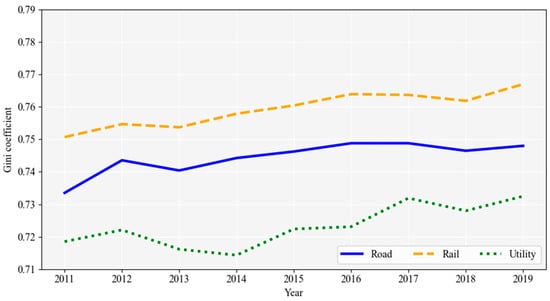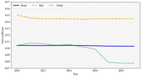 Figure 2 illustrates the expected changes in land prices due to improvements in each form of transportation accessibility for all 247 regions, presenting the temporal trends of regional disparities using the Gini coefficient applied to Equation (8). The projected increases in land prices for region i are calculated as . Contrary to the trend showing regional disparities in accessibility for each local government unit in Figure 1, the results indicate that regional disparities in land value increments for road–rail–utility sectors have consistently widened from 2011 to 2019.