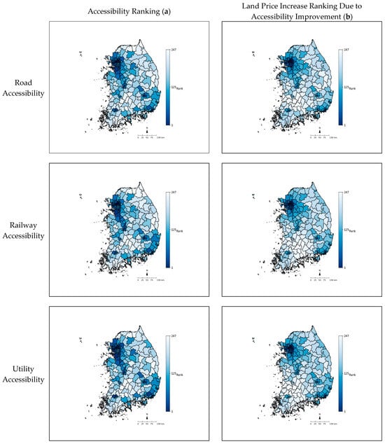 Figure 3 compares the three transportation accessibilities and land value increments for the 247 local government units in 2019, ranking them based on accessibility and land value increments. The comparison, which uses rankings rather than actual increments, mitigates differences between regions due to scale disparities. The distribution of accessibility rankings in the left chart suggests relative equity, particularly in major cities. The accessibility levels in metropolitan areas, particularly those along the central transportation axis, appear favorable and are not excessively skewed. However, the right chart, based on the ranking of land value increments, vividly demonstrates the concentration of land value increases, especially in the capital region, particularly around Seoul. This trend is consistent across all three accessibility types.