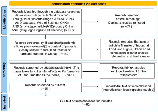 For the literature search, we used a modified PRISMA flow diagram (Figure 1) to illustrate the literature selection process. This flow diagram was adapted from the PRISMA 2020 flow diagram (Page et al., 2020) [28] with some adjustments to better meet the requirements of this study. The method consists of three steps: identification, screening, and inclusion (Figure 1). The specific implementation steps are as follows: (1) Literature identification phase: Using ‘land transfer’ as the search term, literature published from January 2014 to October 2024 was retrieved from the Web of Science Core Collection and CNKI (Chinese Core, CSSCI) databases. A total of 672 preliminary documents were obtained through searches of titles, keywords, and abstracts. Through deduplication using Excel, 65 duplicate documents were removed. (2) Screening phase: Based on title and abstract information, studies related to industrial land transfer, urban land transfer, and other nonagricultural fields were excluded, which yielded 162 peer-reviewed documents focused on rural land transfer. A full-text screening was subsequently conducted on the theme of the ‘effects of land transfer’, and 70 core documents were retained. A three-tier quality assessment was then implemented using the criteria of regional relevance (limited to rural practice cases in China), research content (requiring the analysis of transfer effect dimensions), and methodology (requiring empirical data support). This led to the exclusion of 18 documents that did not meet the criteria. Ultimately, 52 high-quality documents were identified that possessed both spatial scale adaptability and academic rigor (Figure 1). (3) Inclusion phase: The 52 selected articles were incorporated into the systematic review study.