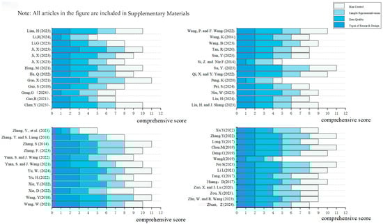 For the 52 relevant articles that were initially screened, a manual content analysis method was employed for a systematic and critical review to identify commonalities and differences among the studies and, on the basis of this, to filter and categorize the effects of land transfer. Since the collected studies include various types of land transfer effects and employ diverse data and measurement methods, only effects that met specific evidence strength criteria were included in the filtering process. To ensure the reliability of the extracted data, we constructed a decision matrix based on four factors, namely the rigor of the research design, the reliability of the data sources, the representativeness of the samples, and the degree of control over various biases, and we evaluated the selected articles accordingly [29]. After all the factors were comprehensively scored, the bias risk of each article was precisely categorized into three levels: low (comprehensive score ≤ 6), medium (6 < comprehensive score ≤ 9), and high (9 < comprehensive score ≤ 12). On the basis of these criteria, we selected articles with high and medium levels of evidence strength, as illustrated in Figure 2.