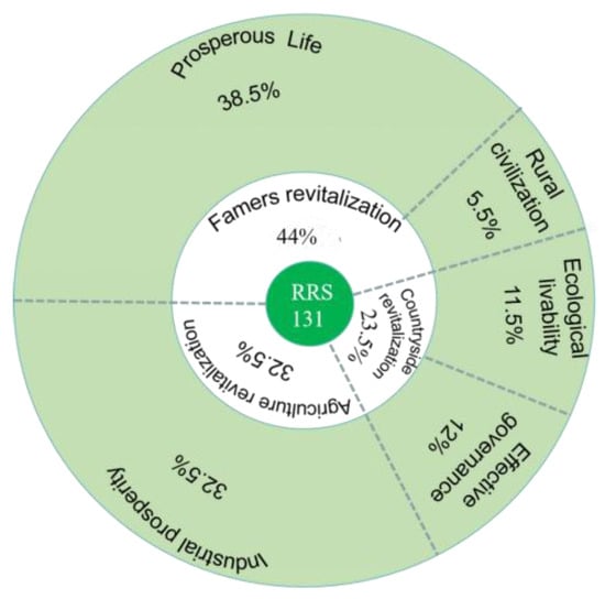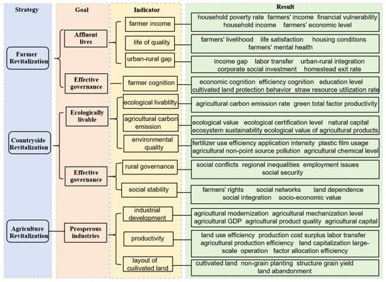 To construct the indicator system, a systematic approach was employed to classify the results of the case studies and map these classifications to the target layer. First, thematic clustering was conducted on the basis of the similarity and relevance of the case results to form an initial pool of indicators. Second, cross-validation with existing literature was performed to ensure the reliability of the indicators. Specifically, we referred primarily to the research findings of certain scholars regarding the evaluation indicator system for rural revitalization and established a systematic indicator system based on five major goal dimensions [31,32,33]. A dual verification mechanism was subsequently employed to ensure the scientific validity and applicability of the indicator system. First, we used bibliometric methods to test the content validity of the indicators by searching for relevant literature from the past five years in the CNKI and Web of Science databases and selecting authoritative studies with citation rates exceeding 50 for comparison to ensure the theoretical foundation of the indicators. Second, a case retrospective method was used for practical validation, in which we reclassified 131 cases into the optimized indicator system and achieved a classification consistency rate of 92.3%, which indicates that the indicator system has good practical applicability. Ultimately, through the comprehensive analysis and verification mentioned above, 12 core evaluation indicators were identified (Figure 3). The affluent living goal includes the three indicators of farmers’ income, quality of life, and urban–rural disparity; the thriving industry goal encompasses the three dimensions of industrial development, cultivated land layout, and production efficiency; the ecological livability goal consists of the three indicators of agricultural carbon emissions, ecological security, and ecological environmental quality. Since case clustering revealed that “farmers’ cognition” is highly correlated with and generalizable to the manifestations of rural civilization, and cross-validation with literature confirmed its consistency with theoretical connotations while avoiding formalistic deviations, coupled with the fact that case retrospective verification showed a classification consistency rate of 91.7%—indicating strong applicability, compliance with the principle of simplicity in the indicator system, and assurance that core dimensions remain undiluted—the “rural civilization goal” in the rural revitalization evaluation index system is thus focused on the single indicator of “farmers’ cognition”; and the effective governance goal includes the two indicators of social stability and rural governance. On the basis of this indicator system, 131 cases were systematically classified into 12 indicators and 5 goal dimensions (Supplementary S2).