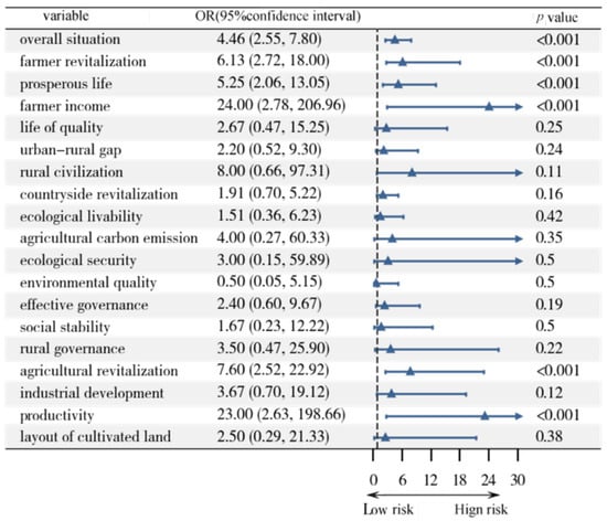 To further quantify the analysis results, the odds ratios (OR) and 95% confidence intervals were calculated to assess the likelihood of various variables producing positive outcomes. The OR value is derived by comparing the odds of positive outcomes to those of negative outcomes. When the OR value exceeds 1, it indicates that the variable is more likely to yield positive than negative outcomes, and the larger the OR value is, the greater the likelihood of achieving positive results. The statistical analysis of the OR values was conducted using STATA Statistics (version 15.0), and the specific results are presented in Figure 4.