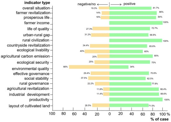 The impact of land transfer on rural revitalization is reflected in two aspects: ecological livability and effective governance (Figure 7). There are a total of 33 related cases, including 21 positive cases (66.7%) and 11 negative cases (33.3%). The odds ratio of positive to negative cases is 1.91; however, the p value is 0.16, which indicates that the promoting effect of land transfer at the strategic level of rural revitalization is not very significant. In terms of ecological livability, the 15 research cases include 9 positive cases, whereas the remaining 6 cases record negative impacts of land transfer on ecological livability. The strategic goal of agricultural revitalization is to achieve a thriving industry, and the positive effects of land transfer on this goal are statistically significant (p < 0.001, OR = 7.6). The total number of research cases is 43, with 38 positive cases (88.3%) and only 5 negative cases (21.7%). The goal of a thriving industry comprises three indicators: industrial development, production efficiency, and cultivated land layout. The positive effect of land transfer is most significant in terms of production efficiency (p < 0.001, OR = 23), and the p value indicates that its positive effect is statistically meaningful.