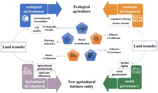 Ecological livability is an intrinsic requirement and key support of the strategy of rural revitalization, and it is highly important for improving rural residents’ quality of life, promoting the green development of the countryside, displaying the unique charm of the countryside, and promoting the integrated development of urban and rural areas [46]. The systematic review reveals that land transfer has dual impacts on the ecological environment. Scale operations may reduce pollution via improved production efficiency and the reduced use of chemical fertilizers and pesticides, but the over-concentration of operations may also lead to ecological risks, such as high-carbon production and biodiversity decline. For example, the use of capital in operations may take advantage of environmental externalities to reduce costs [47], and the transfer of land for sloppy operations exacerbates the degradation of soil quality [48]. The spatial distribution data identified in this study show that the negative ecological effects of land transfer are more prominent in Central China than in other regions, which highlights the importance of vigilance regarding regional ecological risks [49]. The study of moderate-scale management shows that scientific and reasonable land transfer policies can promote soil quality improvement. This requires policy makers to seek a balance between economic benefits and ecological protection and guide farmers to adopt environmental protection measures through regulatory mechanisms (Figure 8).