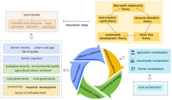 In light of China’s unique fundamental national conditions and practical challenges, the report of the 19th National Congress of the Communist Party explicitly outlined the rural development goals. Within this framework, rural revitalization is not solely manifested in population migration or the improvement in rural infrastructure; rather, it should be regarded as a comprehensive, multidimensional process that encompasses various aspects, such as politics, economics, culture, society, and ecology [55]. Its essence lies in the concurrent revitalization of rural areas and their inhabitants, along with their production and lifestyles, which facilitates the urbanization of farmers’ lifestyles while enhancing rural production and living conditions and achieves the equalization of public services between urban and rural areas [56]. Land transfer refers to the process of legally transferring and optimizing the rights to operate and utilize rural land through market-oriented mechanisms within the context of rural land system reform and aims to promote efficient land use and agricultural modernization [57]. This process is not only related to the development of the rural economy but also closely linked to the implementation of modern property rights theory and the ‘three rights separation’ policy.