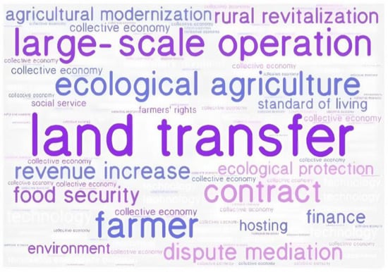 The Chinese government has published numerous typical cases through government websites, authoritative media, and policy documents during the promotion of rural land transfer. These cases cover various regions, different transfer models, and application scenarios and showcase both the successful experiences of land transfer and the problems and solutions encountered in practice. Given that the literature focuses on the benefits of land transfer in a somewhat biased manner, we constructed an automated analysis framework based on Python natural language processing technology. First, we used the Scrapy framework to crawl 60 typical land transfer case texts that are publicly available on official platforms, such as the Ministry of Agriculture and Rural Affairs and the China Rural Network. We employed the BERT semantic model for case similarity calculation and deduplication and ultimately selected 30 effective cases with regional representativeness and model diversity (see Supplementary S4). In the text preprocessing stage, we utilized the Jieba word segmentation tool for part-of-speech tagging and stop-word filtering, combined with the TF-IDF and TextRank algorithms to extract feature vocabulary, and we generated a visual word cloud of the semantic field of land transfer using the word cloud library (Figure 10). The frequency analysis revealed that ‘land transfer’ (occurring 35 times), ‘large-scale operations’ (occurring 16 times), ‘farmers’ (occurring 15 times), ‘ecological agriculture’ (occurring 12 times), ‘dispute mediation’ (occurring 11 times), ‘food security’ (occurring 10 times), ‘farmers’ income increase’ (occurring 11 times), and ‘rural revitalization’ (occurring 9 times) were core high-frequency terms. These terms are highly consistent with the role of land transfer in the five goals—prosperous industries, rural civilization, affluent livelihoods, ecological livability, and effective governance—as elaborated in this paper.