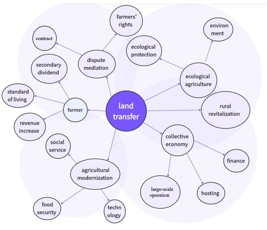 On the basis of the articles retrieved and the current state of rural development, this study analyzes the foundational theories related to the impact of land transfer on rural revitalization (Figure 9). (1) Resource allocation theory aims to achieve maximum benefits through the optimization of resource distribution [58]. During the land transfer process, this theory encourages the concentration of land among specialized large households, agricultural enterprises, and other entities; promotes large-scale and intensive management; effectively prevents the idleness and waste of land resources; and facilitates the aggregation of labor, capital, technology, and other factors, which greatly enhances agricultural production efficiency. (2) Factor mobility theory advocates that the free movement of production factors is key to promoting economic development [59]. Land transfer has been established as a legitimate and orderly channel for the flow of land factors, which facilitates the coordinated movement of labor, capital, technology, and other resources. (3) The theory of property rights emphasizes that clearly defined property rights are fundamental to the efficient operation of economic activities [60]. Land transfer further clarifies the relationships among land ownership, contracting rights, and management rights, which effectively safeguards the legitimate rights and interests of all property rights holders, reduces disputes during the land use process, and encourages contractors to confidently transfer land while allowing operators to make long-term investments with peace of mind. (4) The theory of sustainable development requires that economic growth be harmonized with resource conservation and ecological integrity [61]. Land transfer directs agriculture toward ecological development, promotes green agricultural technologies, facilitates the integration of rural industries, preserves the rural cultural heritage, and achieves sustainable development in rural economies, societies, and cultures. (5) The theory of human–land relationships concerns the interaction between human activities and the geographical environment. Land transfer, informed by natural conditions and demographic factors, leads to the rational adjustment of land use practices to satisfy human needs for land while safeguarding land resources and thereby achieves the harmonious coexistence between humans and land. These theories are interrelated and together highlight the critical role of land transfer in rural revitalization, which promotes comprehensive development in rural areas.