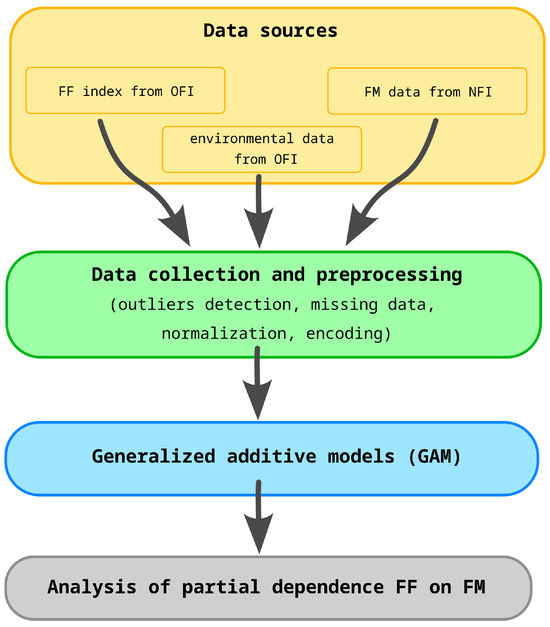 The research methodology was carried out in four stages. First, forest data sources were identified. We have selected data from a time period that corresponds to a dry period in Poland. Information on forest fragmentation was calculated. Then, data on deadwood volume from sanitary cutting and stand characteristics of Scots pine forests were obtained. Additionally, environmental data, including climate, topography, soil types, and geological types, was gathered. Second, data preprocessing was performed. Third, the data were analyzed using the generalized additive model (GAM). Fourth, the partial dependence graphs showing the relationship and effect of the fragmentation index on the probability of Scots pine FM were explained and interpreted.