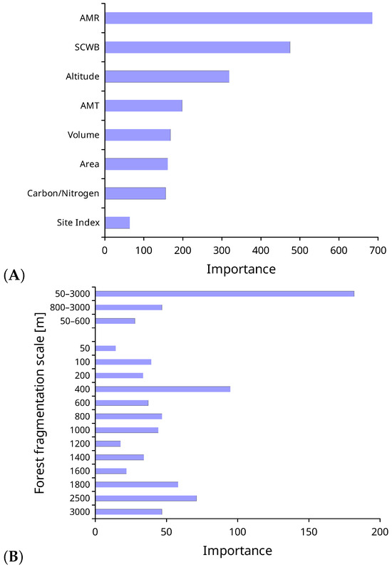 Additionally, the significance of the various independent variables included in the model was analyzed. Figure 3 shows the significance of these variables. Variables from the basic model (Figure 3A) and fragmentation indicators (Figure 3B) are presented separately. Note the distinctive impact of the multi-scale forest fragmentation factor, which combines scales ranging from 50 to 3000 m. Its impact is more than double that of FF ratios for the other scales.
