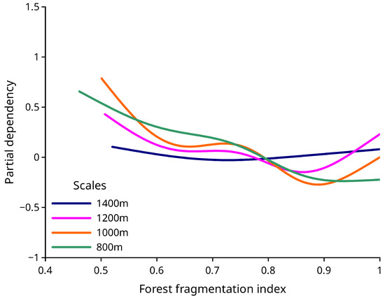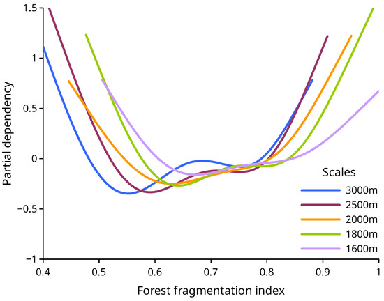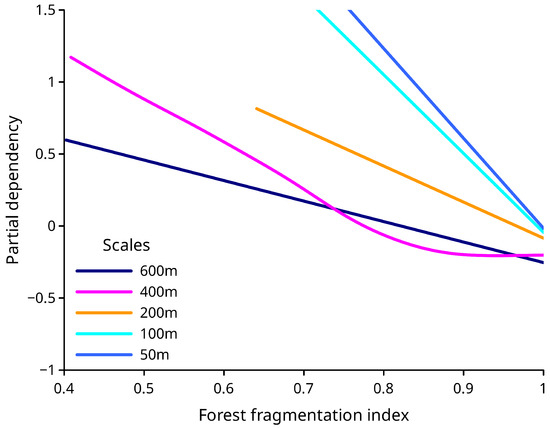 A total of eighteen classification models were developed during modeling. The initial model (base model) incorporated site conditions and stand characteristics. In that model, all predictors were statistically significant, with an average p-value of . The base model explained the effects of site conditions and stand characteristics. After adding the FF index, seventeen additional models were developed, including the impact of FF. The FF index was statistically significant at different p-values (Table 2). We visualized the partial effects of the fragmentation index at different fragmentation scales (Figures 4–6). Since the base model explained the variability of each forest stand’s environment, analyzing the partial effects of the FF index allowed us to determine the relationship between FF and FM without the impact of environmental conditions.