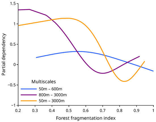 The partial dependence analysis reveals that the FF index’s relationship with FM at the multi-scale level exhibits different tendencies: positive, negative, and neutral (Figure 7). Specifically, a positive relationship was observed between fragmentation indices ranging from 0.3 to 0.96 for a scale composition of 50–600 m, from 0.607 to 0.123 and from 0.832 to 0.889 for a scale composition of 800–3000 m, and from 0.287 to 0.738 for all scale compositions. This indicates that fragmentation within this range increases the probability of FM. In this case, an increase in fragmentation and forest mortality is observed. Conversely, a negative relationship was found between fragmentation indices of 0.96 and 1.00 for scale compositions of 50–600 m, 0.608–0.832 for scale compositions of 800–3000 m, and 0.730–0.930 for all scale compositions, showing that fragmentation in this range positively affects pine forest mortality. This means that as fragmentation increases, forest mortality decreases. However, at a fragmentation index of 0.889 for a scale composition of 50–600 m, 0.608–0.821 for a scale composition of 800–3000 m, and 0.731–0.931 for all scale compositions, there is no significant influence of FF on FM. This implies that when forests become highly fragmented, the likelihood of forest mortality neither increases nor decreases. The highest probabilities of forest mortality occur at fragmentation indices of 0.5 (for scales of 50–600 m and 50–3000 m) and 0.25 (for scales of 800–3000 m).