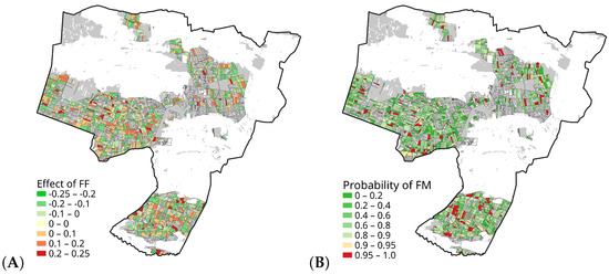 This is a spatial representation of the effect of multiscale (50–3000 m) FF on FM (A) and Scots pine FM probability (B). The gray color shows the total forested area of the Oleszyce Forest Inspectorate.