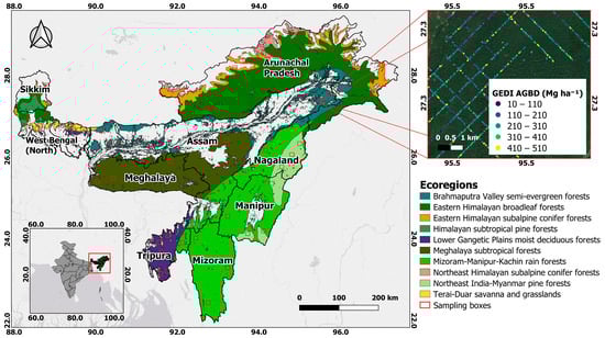 The study area (Indian Eastern Himalayas) and the ten ecoregions represented. Sampling boxes of 5 × 5 km2 are shown as red squares and an example of GEDI AGBD is shown in the upper right panel.