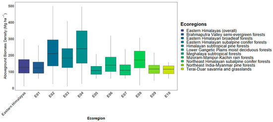Ecoregion-wise, the Himalayan subtropical pine forests (E04) recorded the highest mean AGBD at 245.52 Mg ha−1, followed by the Eastern Himalayan broadleaf forests (E02) with a mean of 219.33 Mg ha−1. The lowest AGBD values were observed in the Terai-Duar savanna and grasslands (E10), Lower Gangetic plains moist deciduous forests (E05), and the Mizoram-Manipur-Kachin rainforests (E07). The higher AGBD in the Himalayan forests can be attributed to the prevalence of mature, intact forests with greater aboveground biomass [94]. The high biomass can also be linked to low population density, lower prevalence of jhum cultivation, and human disturbance, which allow forests to remain relatively undisturbed [95,96]. The lower values in the Terai and Mizoram-Manipur-Kachin regions can be linked to the dominance of degraded and fragmented forests. The low biomass in the Terai region aligns with expectations, as savanna and grassland ecosystems naturally have lower forest cover, eventually contributing to lower tree biomass compared to densely forested regions [97].