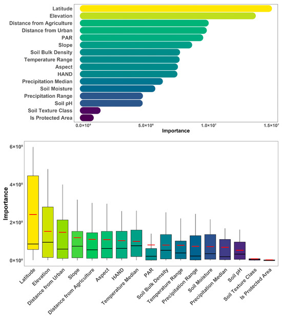 Variable importance plots for the full model for the Eastern Himalayas (above) and the weighted average of variable importance across individual ecoregions (below) ranked by their mean. The red lines within the boxplots represent mean importance values, while the black lines indicate the median. Note: PAR—photosynthetically active radiation; HAND—height above nearest drainage (for individual ecoregions, see Supplementary Figures S12–S21).
