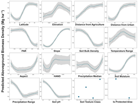 Temperature and precipitation had a moderate influence on biomass distribution. While precipitation variables were included in the model, their lower importance suggests that rainfall may have an indirect effect or be less influential in the Eastern Himalayas compared to other environmental factors. Optimal temperature and precipitation conditions are essential for AGB accumulation, as their effects vary depending on other interacting factors such as soil characteristics, nutrient availability, disturbance regimes, and species composition [94]. Precipitation range data indicated that areas with higher rainfall throughout the year supported greater AGB, a pattern also observed in relation to higher soil water content [129]. These findings underscore the role of water availability in supporting plant productivity and biomass accumulation. Similarly, the partial response function for temperature shows a range of no more than 16–20 °C between maximum and minimum temperatures to be optimal for higher biomass accumulation. A decreasing trend in AGBD with increasing PAR was also observed, as PAR was negatively correlated with latitude, while AGBD increased with latitude in the Eastern Himalayas (Supplementary Figure S1). PAR is a robust measure of primary productivity, as it influences tree physiology and sap flow [25]. However, the decrease of PAR with increasing AGBD in our study suggests a masking effect of anthropogenic and other effects on AGBD over PAR, as seen by the variable importance plot (Figure 3). Nevertheless, within individual ecoregions, we witnessed an increase in AGBD with increasing PAR (E03, E06, E10, Supplementary Figures S22–S31).