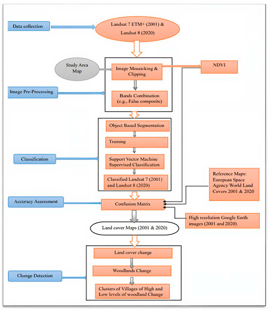 This study aimed to evaluate the change in woodland cover in the Same District in Tanzania’s Eastern Arc Mountains. We conducted LULCC detection for the entire Same District using remote sensing analysis of Landsat 7 for 2001 and Landsat 8 for 2020. We replaced traditional ground truth points with high-resolution Google Earth imagery, NDVI, and a 30 m global cover to create training sites. The alternative solution provided cost savings while also expanding accessibility and coverage of the study area. This study recognizes two main limitations of high-resolution Google Earth imagery, including temporal inconstancy and the absence of spectral data. To address these limitations, we adopted NDVI, and a global cover designed for Landsat’s 2020 image.