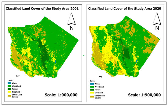 39]. We implemented these NDVI band transformations using ArcGIS Pro (v3.0.3). Lastly, the LULCC of the study area from 2001 to 2020 was determined by comparing the two classified images.