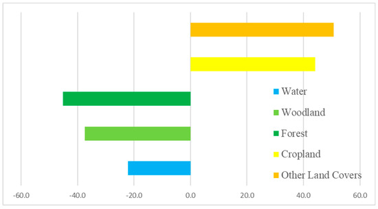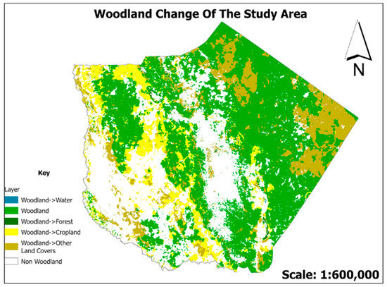 11]. Despite cropland being the second driver in this study, the first being other land covers, such as barren land and built-up areas, agricultural activities can still be the main cause of deforestation in woodlands because other land covers, such as built-up areas, have many combined classes. Similar findings were reported in a study conducted in Ethiopia, which showed that woodlands had decreased because of intense pressure from other land uses, especially agriculture [