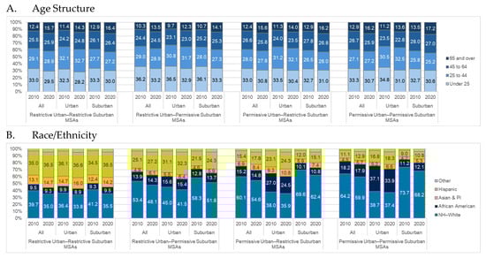 Next, we examine a range of neighborhood characteristics across our metropolitan zoning typologies, including changes in age structure, race/ethnicity, educational attainment, and median gross rent (see Figure 1). Notably, median rents are highest—and increased the most during the 2010s—in metros with restrictive zoning regimes, whereas the more modest rent increases were observed in metros with permissive zoning. In terms of racial and ethnic composition, metros with both urban and suburban restrictive zoning have the largest and fastest-growing shares of Hispanic and Asian residents. Across all four zoning configurations, the non-Hispanic white population declined in both urban and suburban neighborhoods. The Black population share declined in urban areas across all configurations but increased in suburban areas, indicating a notable suburbanization trend. In fact, in metros with restrictive urban and restrictive suburban zoning, the Black population share is now larger in suburban areas than in urban cores—a striking demographic shift for a group historically concentrated in central cities.