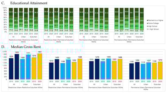 We begin by analyzing population growth across metropolitan and neighborhood types between 2010 and 2020 (Table 3). Among the four MSA typologies, restrictive urban–permissive suburban MSAs experienced the most rapid population growth, with an increase of 15.7% over the decade. In contrast, the lowest growth rate was observed in permissive urban–permissive suburban MSAs, which grew by only 3.3%. The rapid population surge in restrictive urban–permissive suburban MSAs was driven primarily by suburban expansion, as their suburban populations grew by 18.5% during the period.