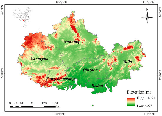 The BGUA is located along the southern coast of China, encompassing key cities such as Nanning, Chongzuo, Fangchenggang, Qinzhou, Beihai, and Yulin (Figure 1). The geographical area spans approximately from 21°13′ N to 23°32′ N and from 106°19′ E to 110°40′ E. This region has a typical subtropical monsoon climate, with an average annual temperature ranging from 22 °C to 25 °C and annual precipitation between 1000 mm and 2000 mm. Vegetation is predominantly subtropical evergreen broadleaf forests, and the region’s ecological environment is complex and diverse. The BGUA coastal area serves as an important ecological barrier in southern China, hosting critical ecosystems such as mangroves, tidal wetlands, and coral reefs, which provide habitats for endangered species. However, with the rapid urbanization development of the BGUA, the ecological environment is facing mounting pressure. As a key gateway for cooperation between China and ASEAN countries, the BGUA plays a pivotal role in the Belt and Road Initiative. Therefore, studying the spatiotemporal evolution of EQ and its driving mechanisms in this region is vital for formulating effective ecological protection policies and achieving sustainable regional development.