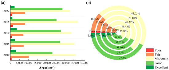 (a) Area and proportion of RSEI grades in the BGUA from 2000 to 2022. (b) the concentric circles correspond to the years 2000, 2005, 2010, 2015, and 2022, from inner to outer.
