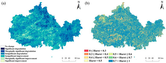 According to Figure 4a and Table 6, the EQ of the BGUA has generally exhibited a positive trend. Specifically, the area showing significant improvement in EQ measures 1340.22 km2, representing 1.85% of the total area, while the area with minor improvements spans 3996.47 km2, or 5.52% of the total area. Additionally, 32,147.60 km2 (44.38%) of the total area demonstrated no significant improvement. Spatially, the regions with significant improvement are primarily concentrated in the southeastern part of Chongzuo, the northwest of Fangchenggang, the southwest of Nanning, and scattered areas in Qinzhou, especially where ecological restoration efforts have been particularly intensive. On the other hand, the area showing significant ecological degradation covers 1177.89 km2 (1.63%), while the area with minor degradation spans 3831.99 km2 (5.29%). These deteriorating regions are mainly found in the eastern part of Nanning, the southern part of Yulin, and scattered areas across other cities.