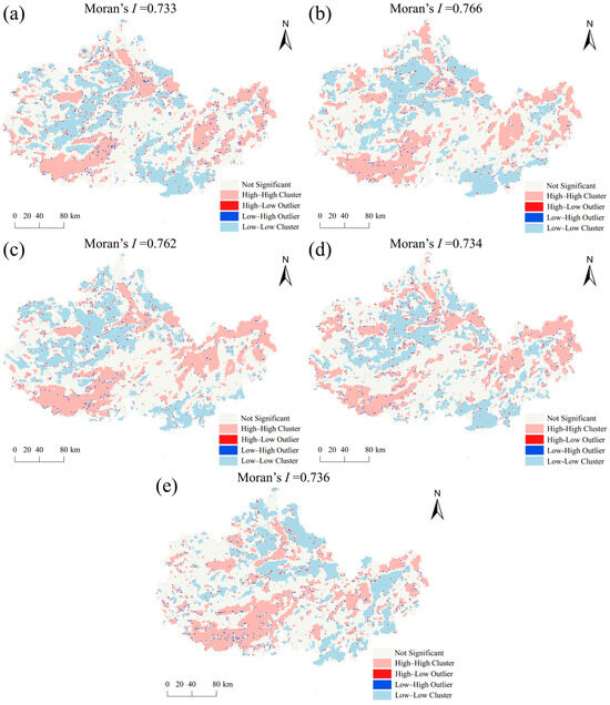 LISA clustering of the RSEI in BGUA from 2000 to 2022. Notes: (a) 2000, (b) 2005, (c) 2010, (d) 2015, (e) 2022.