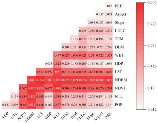 In this study, 13 factors were selected as independent variables, including RSEI (NDVI, WET, NDBSI, and LST), natural factors (TEM and PRE), socio-economic factors (GDP, POP, and NTL), terrain factors (DEM, Slope, and Aspect), and LULC. RSEI was chosen as the dependent variable. The selected driving factors were rigorously chosen based on their relationships with the RSEI components (NDVI, WET, NDBSI, and LST), systematically capturing both natural processes and anthropogenic influences on ecological quality [31,44,45]. Data was extracted by creating a 3 km × 3 km fishnet, and the natural breaks method was used to divide the independent variables into 5 categories. The data was then imported into the geographical detector for factor and interaction detection analysis. The larger the q value for single factors and interaction factors, the greater their explanatory power, indicating that the factor has a greater influence on RSEI.