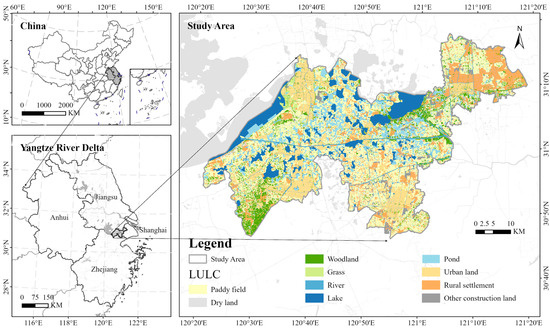 Land use data were obtained from the Resource Environmental Science and Data Platform but, owing to limited accuracy in distinguishing forest and water bodies, were corrected using contemporaneous ESA land-cover data. We classified land use/land cover into ten categories: dryland, paddy field, grass, woodland, lake, pond, river, urban land, rural settlement, and other construction land. Finally, all datasets were harmonized to a common spatial resolution of 30 m × 30 m.